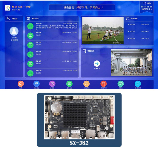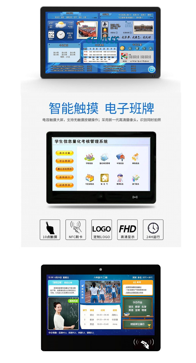 电子班牌解决方案,采用高性能、高稳定性的主板,丰富的扩展接口,可适配所有尺寸的显示屏,触摸屏;主页上显示班级的基本信息,包括天气、班名、课程表、值日表等,让智能设备融入到校园信息化中,学生还可对课程进行反馈,可以支持触摸屏,摄像头,人体感应等互动方式,有效的保障教学和课堂质量,共同打造真正的数字化智慧校园
